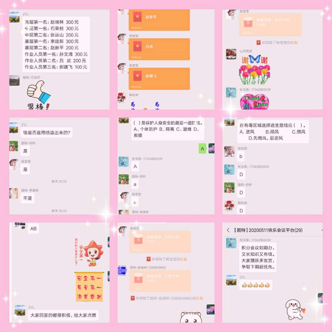 本期快樂會議,線上方式已是第三期,疫情影響了線下歡聚,但沒阻斷固特家人們的快樂傳遞。微信線上,期期如約。大家一樣暢享企業文化的歡樂氛圍。為了能更貼近員工群體,更加激發快樂會議的參與熱情。本期快樂會議的互動環節,不但有紅包分享,還增加了五花八門的知識競猜,并特別加入安全基礎題。這兩組知識題類競猜,讓微信群競答氣氛格外熱烈。各類看似熟悉而又陌生的冷知識激發大家的好奇心憑著個人的認知競猜答案,主持人的答案解析又讓人增加見聞。而安全基礎知識,大家都能積極應答正確判斷,展示了固特員工安全理論實力。融合著微信群內員工互動競猜的熱烈氣氛,一番又一番的紅包拼手氣,更加掀動了快樂會議的歡樂情緒,大家不單單關注個人的幸運紅包大小,更關心哪位是手氣最佳和手氣最差,因為,無論是誰,這兩類人員都要即興演個小節目。節目不限類別,演唱、背詩甚至指定人員代演都行。這樣“沒有底線”的即興發揮,怎能不讓“看熱鬧”的參會群眾心有期待呢?!期待更多人借此機會機會展示自己,為大家帶來歡樂,增進團隊間的了解和情誼。