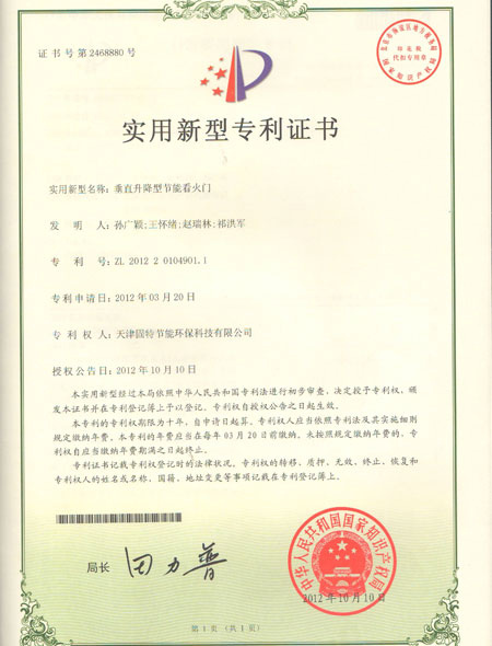 固特節能:垂直升降型節能看火門專利證書